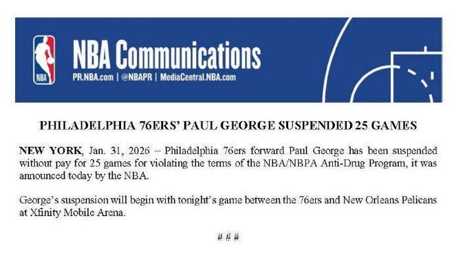 北京时间2月1日,NBA官宣重磅罚单,76人核心之一的乔治因违反联盟禁药政策,被禁赛25场比赛,他将直接损失1174万美元薪水。乔治本人发布声明向76人和球迷道歉,并且表示是寻求治疗过程中“误服不当药物”。
