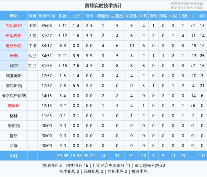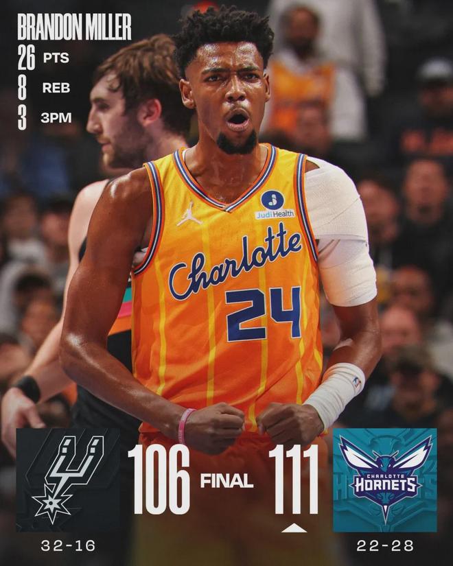 黄蜂榜眼布兰登-米勒跟文班是同届新秀,今天米勒风头盖过文班:投篮21中7,三分9中3,罚球9中9,得到26分8板2助1断1帽。得分全场最高,正负值+13全场第二高。跟文班对位的迪亚巴特,拿到12分10板6助2帽,正负值+19全场最高。
