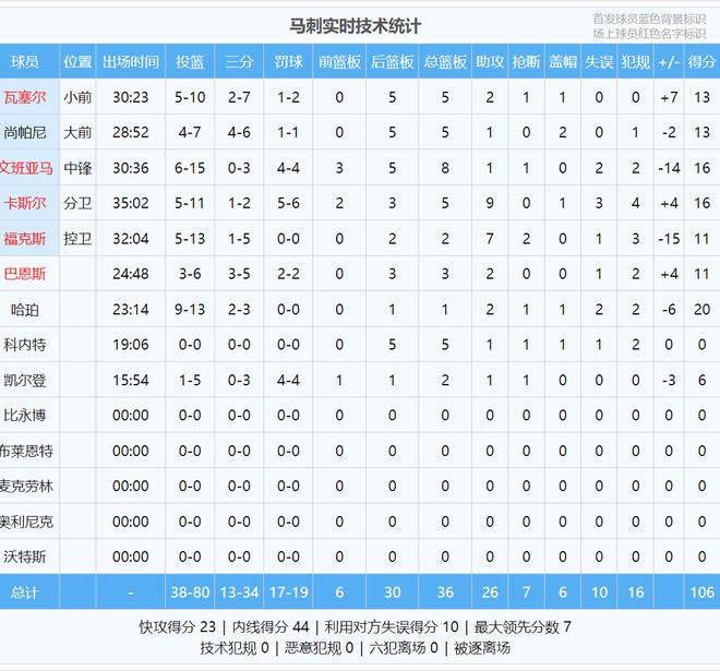 文班亚马投篮15中6,三分3中0,罚球4中4,得到16分8板1助1断2失误,正负值-14全场第二低。最近5场比赛,文班有3场命中率不超过40%。马刺主帅米奇-约翰逊赛后说:“外界对文班有着近乎苛刻的期待,总希望他能包办一切。”