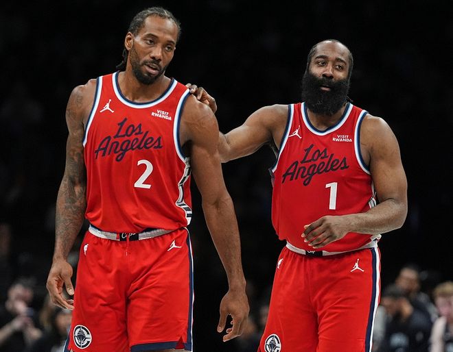 新赛季,快船队低开高走,北伐之路荡气回肠!赛季前27场,快船队6胜21负,一度垫底西部;近21场比赛,快船队17胜4负,一步一个脚印冲到西部第9位。在这个过程中,哈登和小卡立下赫赫战功!哈登出战44场,场均贡献25.4分+4.8篮板+8.1助攻+1.3抢断。尤其是在快船队VS黄蜂队的比赛中,哈登爆砍55分,创快船队史得分纪录。小卡出战35场,场均贡献27.6分+6.2篮板+3.6助攻+2抢断。尤其是在快船队VS活塞队的比赛中,小卡爆砍55分,刷新个人生涯纪录,并且追平哈登创造的快船队史得分纪录。