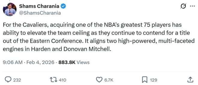 正如名记Shams所说:“对于骑士队来说,引进哈登这样一名75大巨星显然能够提高球队上限,他与米切尔的联手将让球队有资格在东部竞争冠军。”