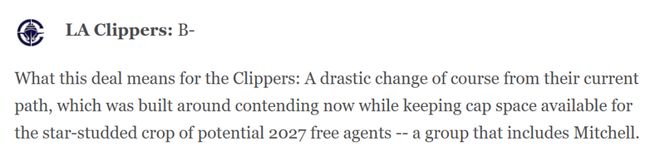 唯一的风险是加兰的伤病问题与矮小的身材,这也是他们仅拿到B-的原因,但快船在如此艰难的困境中找到一条看起来是两全的策略已经实属不易。