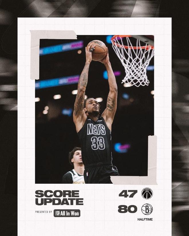 次节比赛,篮网连续两节单节得分30+,且限制奇才连续两节得分不足30分,篮网继续压制奇才扩大30+领先优势。尚帕尼三分命中打破奇才长达9分钟0运动战进球局面,篮网单节34-27净胜7分,上半场结束篮网扩大80-47领先奇才33分巨大优势。