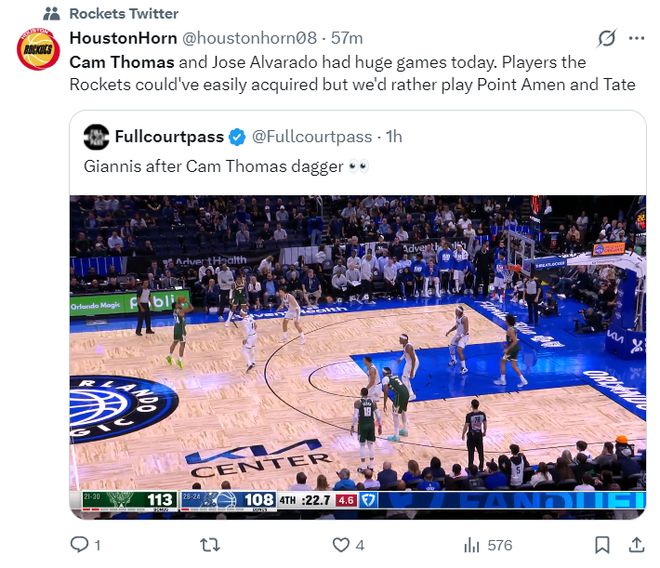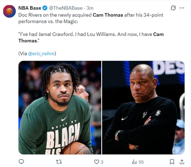 休媒赛后转发了托马斯超远三分的瞬间写道:原本我们有机会签下托马斯这样的得分手,但乌度卡更愿意使用阿门、泰特这样的防守者都不愿意签得分手。