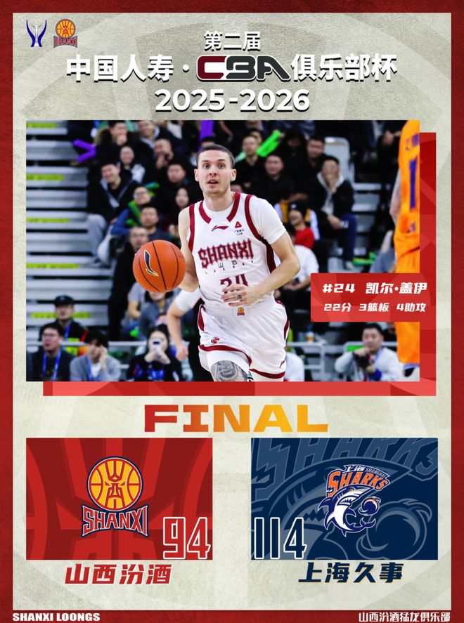 北京时间2026年2月12日19:30,第二届中国人寿·CBA俱乐部杯决赛打响,山西汾酒在内蒙古体育馆,挑战卫冕冠军上海久事。本场比赛,山西队进攻状态欠佳,防守不够积极主动,包括篮板球处于劣势,导致大比分落后,下半场全队有明显改善,并在末节奋力追分,但终究不敌对手,最终全场比赛结束,山西汾酒94:114不敌上海久事,获得第二届CBA俱乐部杯亚军。