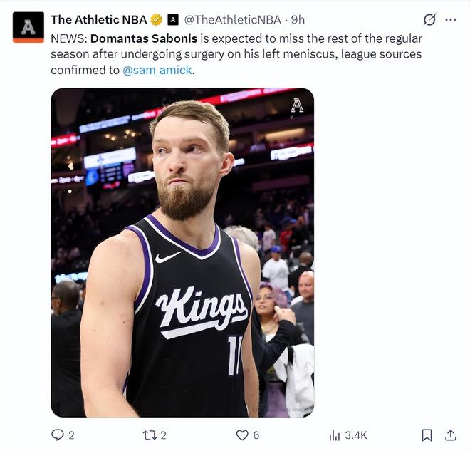 北京时间2月19日,根据TA记者萨姆-阿米克的报道,小萨博尼斯在美国时间周三上午接受了左膝半月板修复手术,他将缺席余下的所有比赛。本赛季小萨一直都被半月板伤势困扰并试图带伤出战,但因为保守治疗效果一直不好,最终决定接受手术。
