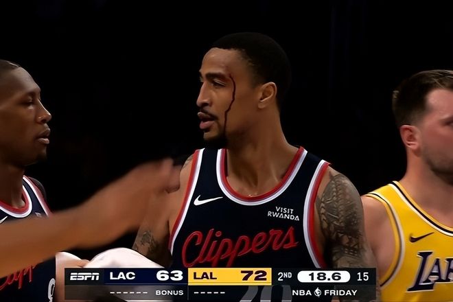 首节湖人手感火热,单节轰下41分,东契奇单节独砍17分接管战局,快船三分5中0,湖人以11分领先。次节伦纳德找回状态,单节砍19分带领快船追分,湖人“东詹里”三巨头合力轰下47分顶住反扑。第二节末段,快船科林斯被犯规后脑袋着地,血染赛场,下半场被迫休战。半场战罢,湖人72-65领先7分。