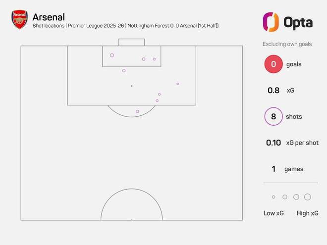 此役客场对阵诺丁汉森林,阿森纳在上半场共有8次射门,这是他们自2019年12月阿尔特塔执教枪手首战、对阵伯恩茅斯(当时上半场9次射门)以来,阿森纳在英超射门次数最多却没有一次射正的上半场比赛。