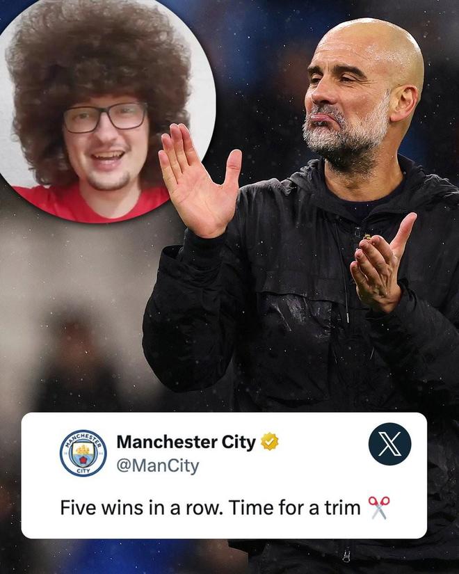 调侃曼联球迷蓄发哥,曼城官方:五连胜,是时候修剪一下了